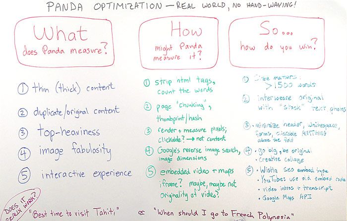 Today we're going to talk about Panda optimization. We're going to talk about real world things you can do, no general hand waving. We're going to talk about specific tactics you can use. We're going to talk about first of all what does Panda measure, secondly, how might Panda actually go about measuring these factors on your site, and then lastly, what are you going to do to win based on those factors.