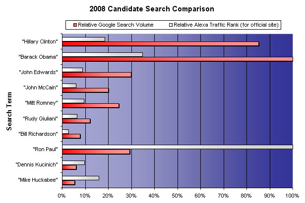 As you can see, there's been a bit of shuffling. People with semi-functional eyes will notice the huge surge in Ron Paul's Alexa Traffic Rank. For more on what the hell that's all about, you can check out my article on the Ron Paul Effect.