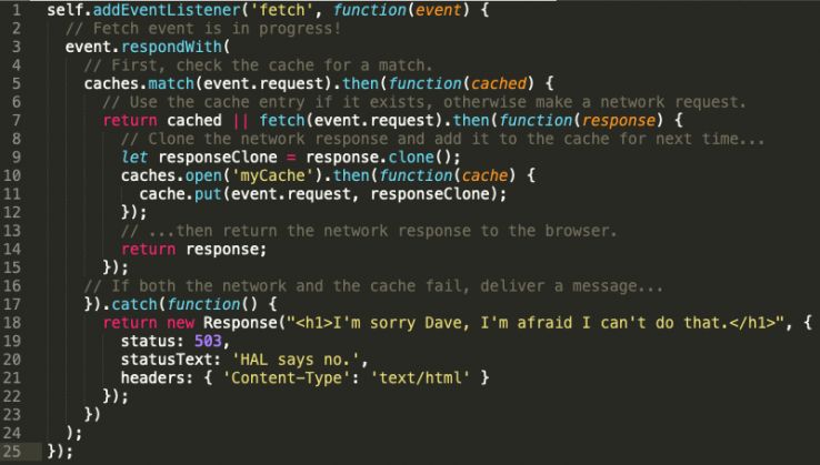 I hope that this (hugely simplified and non-production ready) example illustrates a key point, namely that we have extremely granular control over how resource requests are handled. In the example above we’ve opted for a simple try-cache-first, fall-back-to-network, fall-back-to-custom-page pattern, but the possibilities are endless. Developers are free to dictate how requests should be handled based on hostnames, directories, file types, request methods, cache freshness, and loads more. Responses - including entire pages - can be fabricated by the service worker. Jake Archibald explores some common methods and approaches in his Offline Cookbook.