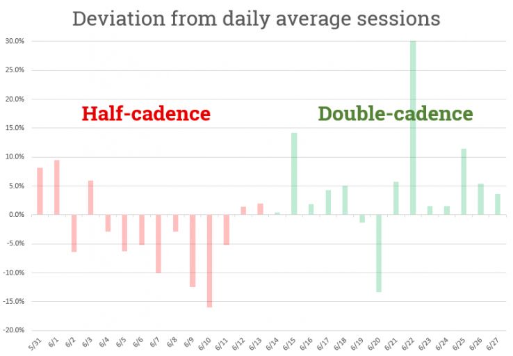 There's a bit of a difference. You can tell the traffic during half-cadence weeks was a little lower, and the traffic during double-cadence weeks appears a little higher. I'd take the numbers highlighted above in green over the ones in red any day of the week, but those curves show far smaller variation than we'd anticipated.