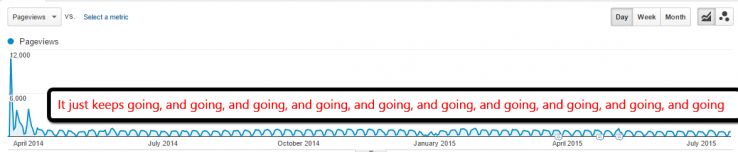See all those tiny bumps of long-tail traffic? The post still consistently sees 3-4,000 uniques every week, and has just crossed over 300,000 all-time. That's somewhere between 60-100x a post we'd call just fine.