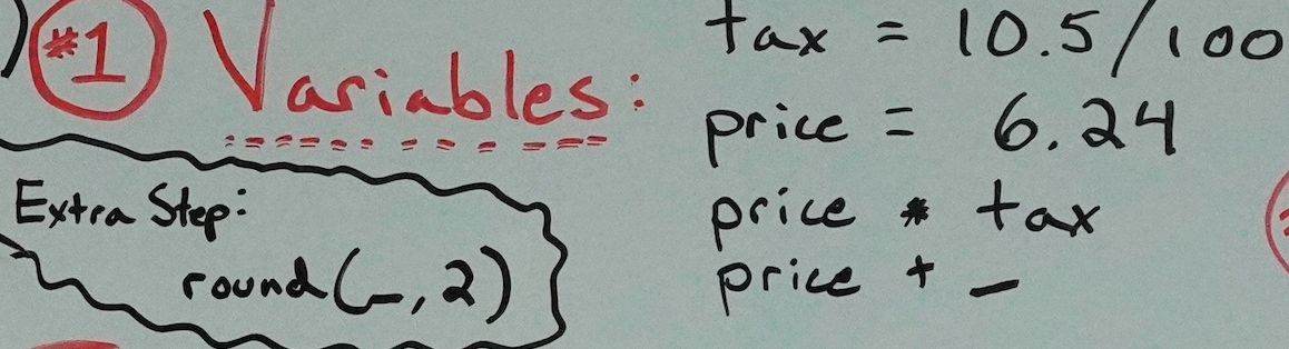 Variables are super, super important in Python. So this is where you just assign values to words or whatever variables you're working with. This is sort of a silly tax price example here, where we assign a numerical value to tax and we do the same for price.
