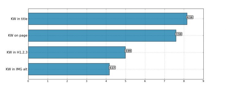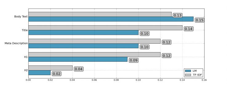We measured the relationship between the keyword and the document both with the TF-IDF score and the language model score and found that the title tag, the body of the HTML, the meta description and the H1 tags all had relatively high correlation: