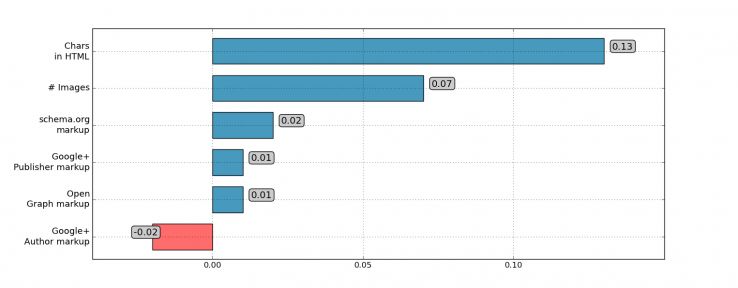We also computed some additional on-page correlations to check whether structured markup (schema.org or Google+ author/publisher) had any relationship to rankings. All of these correlations are close to zero, so we conclude that they are not used as ranking signals (yet!).