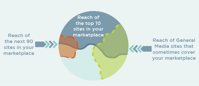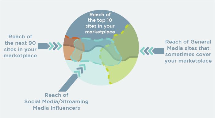 The first thing to realize is that number of potential customers in a marketplace is finite, and so are the number of major media sites and blogs that have any real audience. A typical audience reach for the bloggers and media in a marketplace might look something like this: