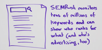 SEMrush is another one. SEMrush monitors tens of millions of keywords. I think it's something in excess of 50 million keywords in the United States and many more millions outside the U.S. as well. They can show who ranks for what today as well as historically, so you can see over time the trend there, and you can see who's advertising. If you say, "Hey I know that this competitor is targeting the same market space as us," I can now go to SEMrush. I can plug them in. I can see all the keywords that they're getting organic traffic from and paid traffic from. Then, I can start to say, "All right. Maybe I should add this to my keyword research list. Maybe I should target these, etc."