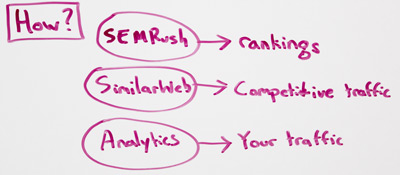 Explaining why traffic has gone up or down drives SEOs nuts. I'm sure most of you are sitting there going, "Yeah, that's just the worst." How we can do this is SEMrush with rankings, SimilarWeb with competitive traffic, and our own analytics to show us data. By combining these, we can essentially say, "Hey, I saw my search traffic go up. Is that because I now rank for more stuff?"