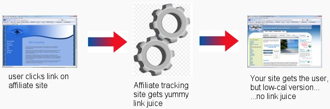 Companies like Commission Junction and Google's own AdSense will do the implementation for you (and take a piece of the pie), but the real reason NOT to use one of these services is that the links to your site are going to be redirected through THEIR site, so that they can track the clicks, sales, etc. What this means, of course, is that when a crawler looks at your affiliate's page, it's going to see a link to the third-party affiliate site, NOT your site.