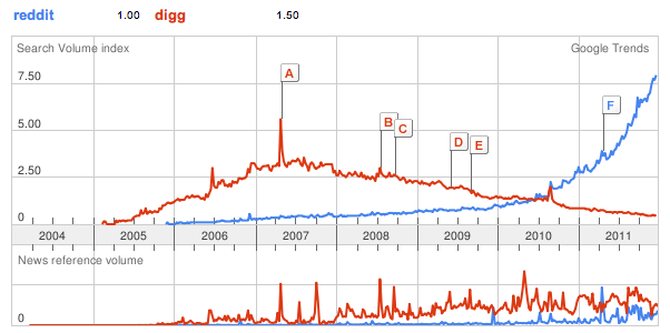 10. Digg fell to insignificancy while Reddit went exponential