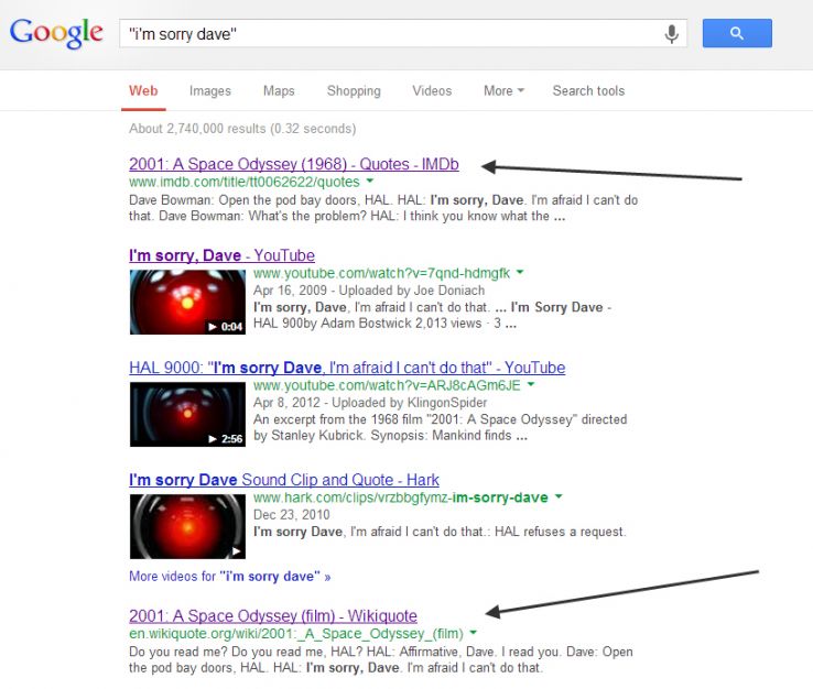Or in my previous example above, when people are searching for "I'm sorry Dave," Google can fairly easily match that query to the entity 2001: A Space Odyssey across web documents that co-reference the IMDb page, and return results for that entity without relying on keyword string matches in HTML tags and anchor text.