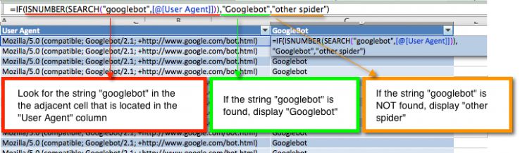 3. Isolate Googlebot from other spiders by creating a new column and writing a formula that searches for “Googlebot” in the cells in the 3rd column.