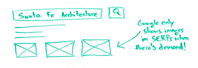Well, for any given keyword, for example, I searched for "Santa Fe architecture" here, and there's a result, I think at the top. Maybe it's an ad result. Then there's the image block with a few photos in there. Google is only going to show that image block if and when the searchers are actually clicking over to images very frequently, or there are lots of searches directly on Google Images for that term. So Google itself can sort of be that indicator for you of whether there's demand.
