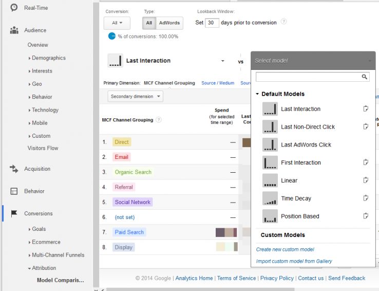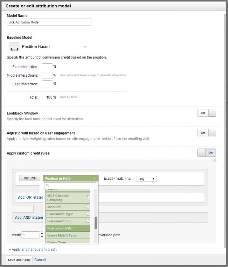 If we did think that there was a 40% chance of a conversion being caused by an initial visit, we’d want to assign 40% credit to “Position in Path” exactly matching “First interaction” (meaning visits that were the user's first visit). If you want to use “Position in Path” as your sole predictor of the chance that a visit generated the conversion, you can. Provided you don’t pull the percentages off the top of your head, it’s better than nothing. If you want to be more accurate, there’s a veritable smorgasbord of additional custom credit rules to choose from, with any default model as your starting point. All we have to do now is figure out what numbers to put in, and realistically, this is where it gets hard. At all costs, do not be tempted to guess—that renders the entire exercise pointless.