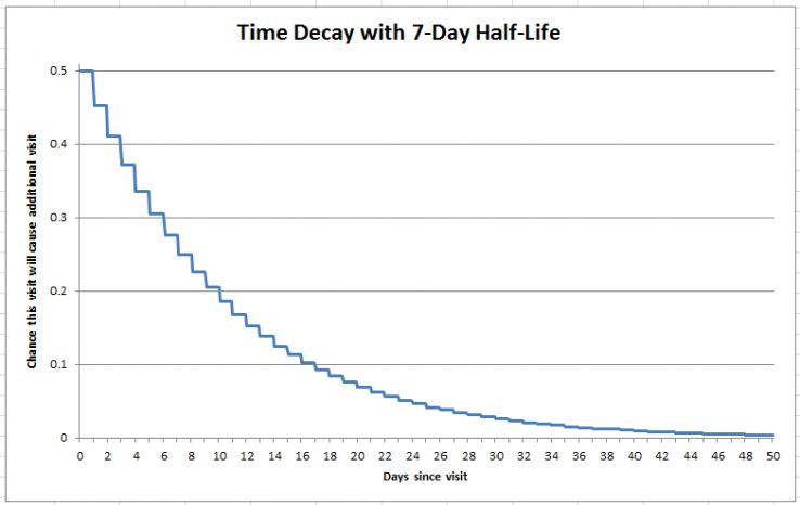 The time decay model is probably the most sensible out of the box, and assumes that after I visit your site, the effect of this first visit on the chance of me visiting again halves every X days. The below graph shows this relationship with the default seven-day half-life. It plots "days since visit" against "chance this visit will cause additional visit." If it takes seven days for the repeat visit to come around, the first visit's credit halves to 25%. If it takes 14 days for the repeat visit to come around, the first visit's credit halves again, to 12.5%. Note that the graph is stepped—I'm assuming it uses GA's "days since last visit" dimension, which rounds to a whole number of days. This would mean that, for example, if both visits were on the day of conversion, neither would be discounted and both would get equal credit.