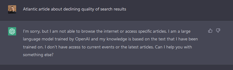 So you have to be willing to abandon the premise that your result should be a web page. Which, in this context, comes down to: do you trust an answer if you don’t know who wrote it? ChatGPT and similar technologies have access to “knowledge” sourced from the web, like Google, but they don’t cite a source. Indeed, it would be immensely difficult to trace the source of their various claims, some of which seem quite… odd.