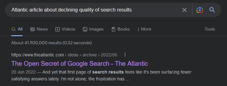 People have talked for a long time about existential threats to Google's dominance, and often, implicitly, by extension, SEO. You’ll have heard the claims that Amazon or YouTube are now preferred engines for certain kinds of search, or that Google is going to struggle against the unique technological advantages of Apple, AI chatbots, the unique regional advantages of Baidu, or the unique format advantages of TikTok. Or maybe you’ve even heard that people prefer to restrict their searches only to Reddit. Even mainstream outlets are suggesting that Google search quality may be in decline.