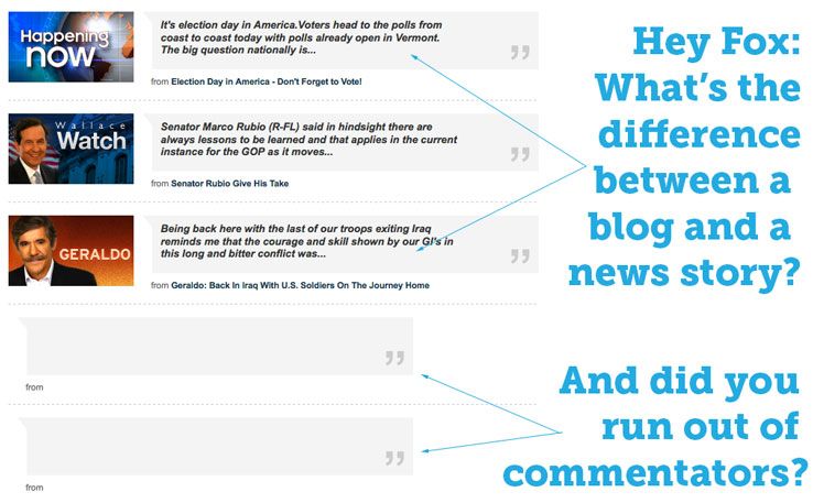 If you can explain the value that blogs.foxnews.com adds to the Fox News site, you've got a keener eye for content strategy than I do. My guess, from the empty blog bubbles here, is that this is a failed (or abandoned) experiment and will soon disappear.