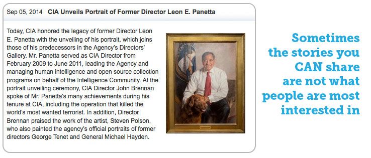 Sure the CIA has a blog, but with posts like "CIA Unveils Portrait of Former Director Leon E. Panetta" and "CIA Reaches Deep to Feed Local Families" it reads more like a failed humanizing effort than anything you'd actually want to subscribe to (or worse, read). If you're in a business where you can't talk about what you do, a blog might not be for you.