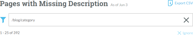 I can quickly see that these pages account for 392 of my missing descriptions — a whopping 43% of them. If I'm concerned about this problem, then it's likely that I could solve it with a fairly simple CMS page, wiping out hundreds of issues with a few lines of code.