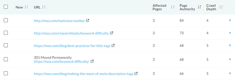 Fortunately, you can now sort by Page Authority (PA) and Crawl Depth in Site Crawl. PA is our own internal metric of ranking ability (primarily powered by link equity), and Crawl Depth is the distance of a page from the home-page: