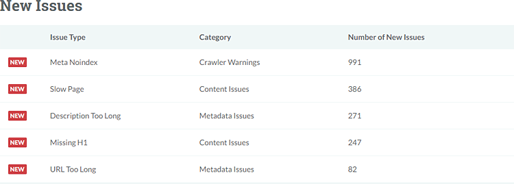 Finally, as time goes on, you'll also want to be alert to new issues, especially if they appear in large numbers. This could indicate a sudden and potentially damaging change. Site Crawl now makes tracking new issues easy, including alert icons, graphs, and a quick summary of new issues by category: