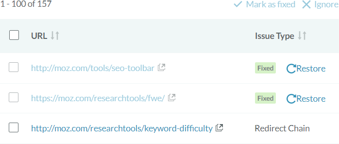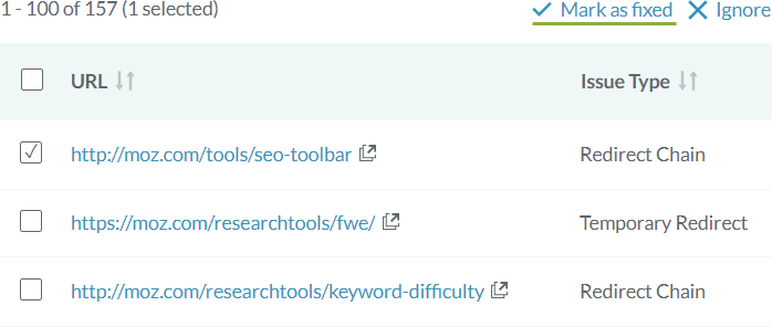 It's fine to ignore issues that don't matter to your site or business, but many of you asked for a way to audit fixes or just let us know that you've made a fix prior to our next data update. So, from any issues page, you can now select items and "Mark as fixed" (screens below edited for content).