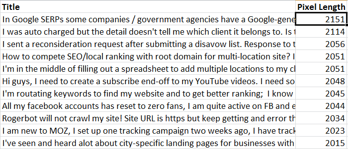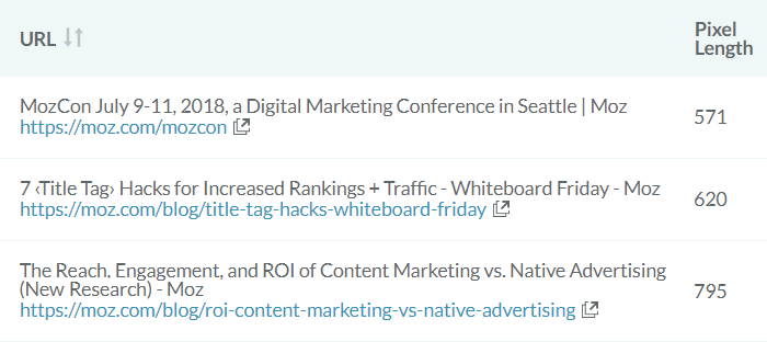 For years now, we've known that Google cut display titles by pixel length. We've provided research on this subject and have built our popular title tag checker around pixel length, but providing this data at product scale proved to be challenging. I'm happy to say that we've finally overcome those challenges, and "Pixel Length" has replaced Character Length in our title tag diagnostics.