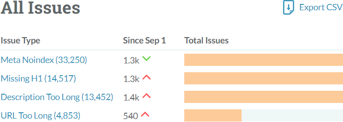 When we rebuilt Site Crawl, we were thrilled to provide data and exports on all pages crawled. Unfortunately, we took away the export of all issues (choosing to divide those up into major issue types). Some of you had clearly come to rely on the all issues export, and so we've re-added that functionality. You can find it next to "All Issues" on the main "Site Crawl Overview" page: