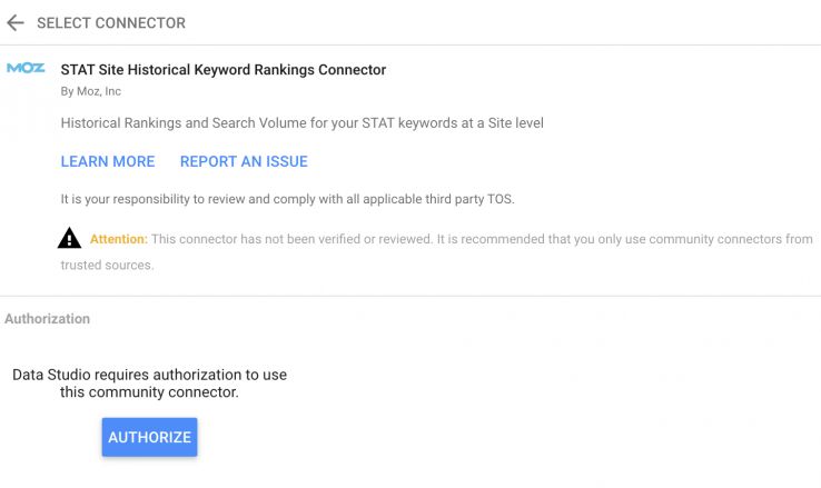 Whether you’re a Google Data Studio pro or a bit newer to the tool, setting up the connectors shouldn’t be too arduous. Get started by visiting the page for the connector of your choice. Authorize the connector by clicking the Authorize button. (Tip: Each connector must be authorized separately.)