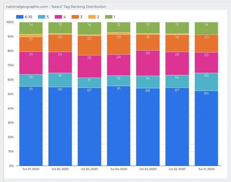 View your top ranking positions as a bar chart to easily eyeball how your rankings are distributed, where shifts are taking place, and where there is clear opportunity for improvement.
