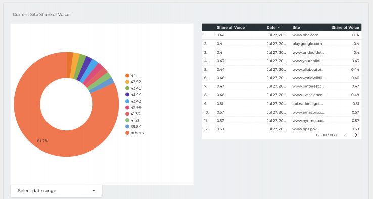 The default chart type will display a doughnut chart for current share of voice, and a line graph will show share of voice over time: