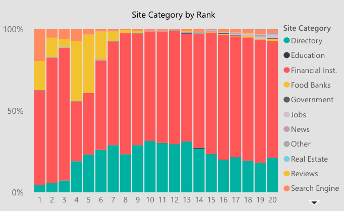 Okay, now let’s mash up our data sources to see how the distribution of website categories varies by rank on desktop devices. Suddenly, we can see that financial institutions actually occupy the majority of the top 3 results while reviews sites and directories are more prevalent in positions 4-10.