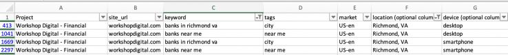 - Tags: Enter as many keyword tags as you want, separated by commas. I used “city” and “near me” as tags to distinguish between the query types. (This is an optional column that you can leave blank.)