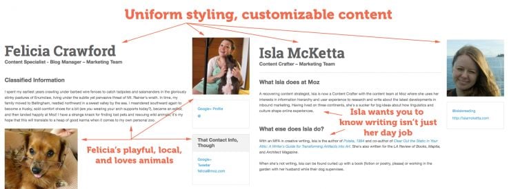 You'll note that all of this content is front and center because it helps our audience get to know us. Our audience becomes acquainted with our slightly quirky personality through our voice and the style of our imagery. We put our values out in the open for all to see so we can hold ourselves accountable and so our audience can know what to expect. And you can tell a lot about Moz by the fact that everyone who wants to be is listed on our team page (not just a selection of the top execs) and that each individual Mozzer's page has their own voice.