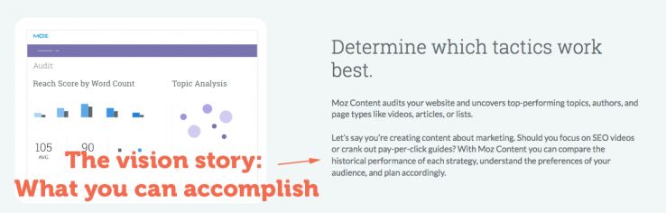 Teaching stories give your audience an opportunity to learn from a mistake without ever having to make it. They also help you shape that audience's understanding of the potential solutions available to them. For example, if I were to tell you that a site audit can help you understand all the content resources you have available to you and use Moz Content as my auditing tool, I'd be pointing you in the direction of a solution for you and also making it easy for you to choose our solution.