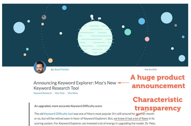 Our blog also tells values in action stories. We do this both through the teaching that is so core to who we are but also through the tone of content on the blog. This goes back to TAGFEE. Rarely (if ever) will you see a brand or competitor called to the carpet on our site. And our product and company updates are just as likely to tell you the ugly side of why we made the improvement as they are to celebrate the update, like this announcement of Keyword Explorer: