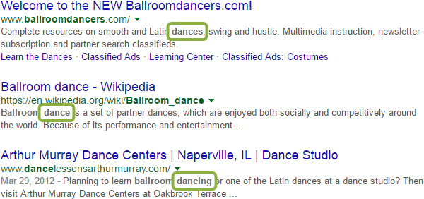Plurals are relatively easy. Let's step it up a little. Another frequent problem in search is dealing with stemming, which relates to root words and the forms they can take, such as "run" vs. "running." Here's a sample search for "ballroom dancer":