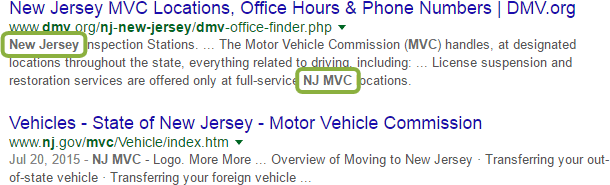 Not surprisingly, Google understands that "NJ" equals "New Jersey." There's a problem with this search, though – New Jersey doesn't call their motor vehicle office the DMV, they call it the MVC (Motor Vehicle Commission). Google understands not only how to expand an acronym, but that the acronyms DMV and MVC are conceptually equivalent.