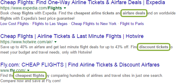 Here, "discount airfare" gets matched to "airfare deals," "discount tickets," and "cheapest flights," with even more variations on the rest of page one.