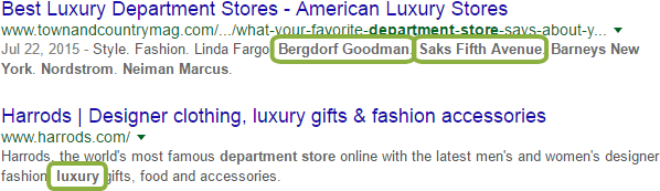 Not only does Google recognize that "upscale" is synonymous with "luxury," but they've matched on actual examples of luxury department stores, including Bergdorf Goodman, Saks Fifth Avenue, and more.
