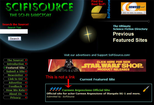 Today I was adding some sites to the directory. I clicked on one, ScifiSource, "your source for science fiction on the web." The site is 90s-tastic, but whatever, a lot of sites still are nowadays. I clicked on "Featured Site" to get an idea of what kind of sites get added to the directory. The current featured site is "Carmen Argenziono Official Site," the "official site of Carmen Argenziono of Stargate SG-1." Okay, fine and dandy. I hover over the link to click on it ("Carmen Argenziono Official Site," right there in green), only to find that...it's not a link. Whuh?