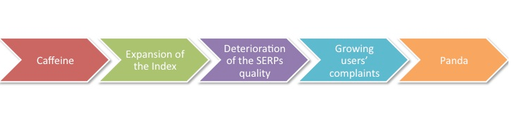 For example, Panda should be seen as a needed action that Google took in order to solve a problem caused by the technological advancement of Caffeine. In fact, with Caffeine (June 2010), Google was able to find new pages (or new information about existing pages) and could add them straight to the index.