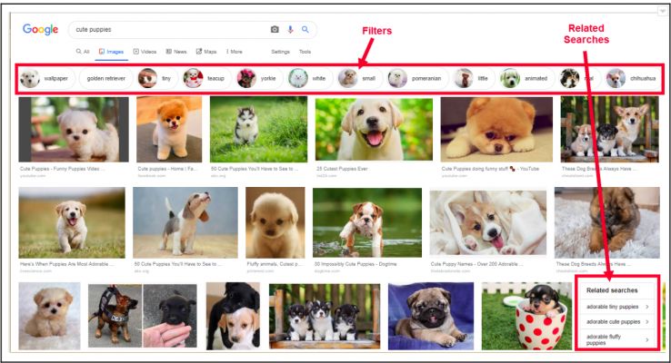 Boxes with Related Searches are now also included with Image Search results. It's interesting to note that Related Search results in Google Images started surfacing at the same time that Google began translating image Title Tags and Alt Tags. It coincides well with the concept that Entity-First Indexing, that Entities and Knowledge Graph are language-agnostic, and that Related Searches are somehow related to the Knowledge Graph.