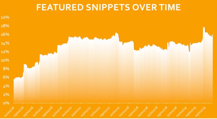 Featured Snippets or "Answers" first surfaced in 2014 and have also expanded quite a bit, as shown in the graph below. It is useful to think of Featured Snippets as rogue facts, ideas or concepts that don’t have a full Knowledge Graph result, though they might actually be associated with certain existing nodes on the Knowledge Graph (or they could be in the vetting process for eventual Knowledge Graph build-out).