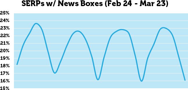 While the scale of the change was much smaller (please note that both graphs have a restricted Y-axis to make the effect more visible), the opposing shapes of the curves seemed like more than a coincidence. As News results increased, the average page-1 organic result count decreased.