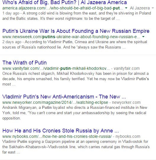 Then, just a couple of weeks later (our systems detected this on the morning of April 8th), Google went much farther, removing the thumbnails and even the byline. Here's part of a screenshot for "Putin":