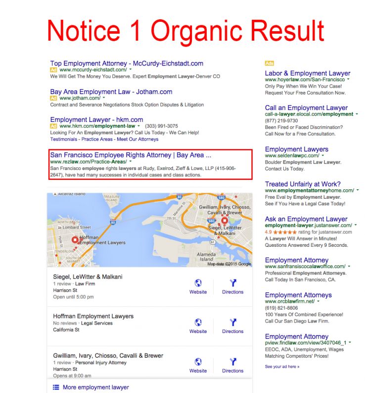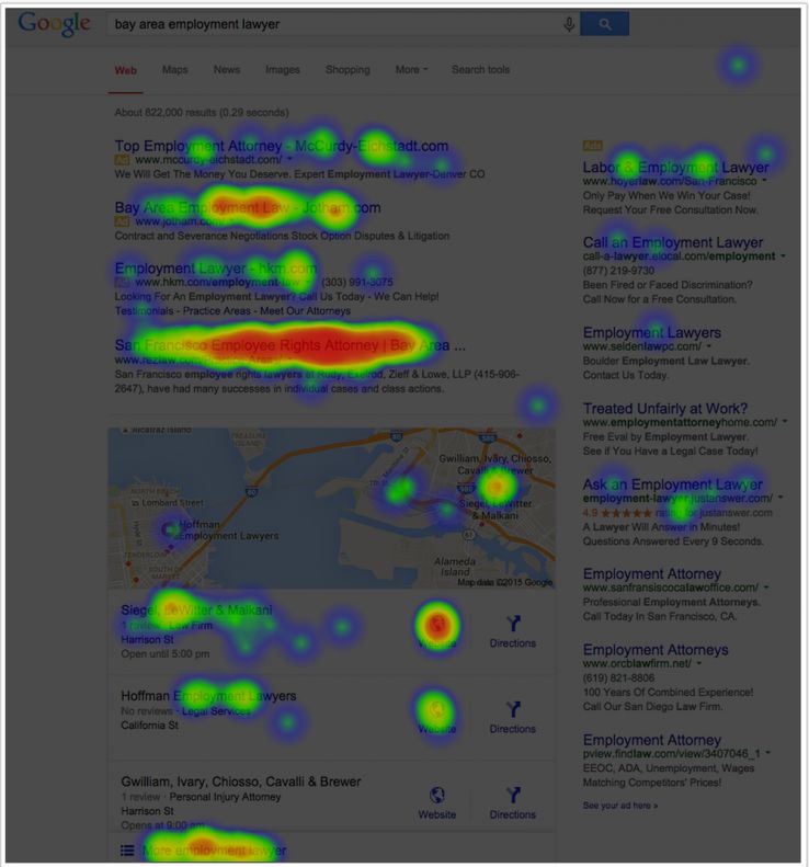 This is the same test we conducted in our post last week, now using a different data collection method, as mentioned above. Although we haven't seen these listings as much in the SERPs, it's interesting to see the impact the single organic listing has on clicks. In this test, we asked the user where they would click if they were researching an employment lawyer. The heat map is shown below. The line in the heat map represents the average fold.