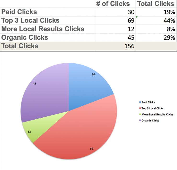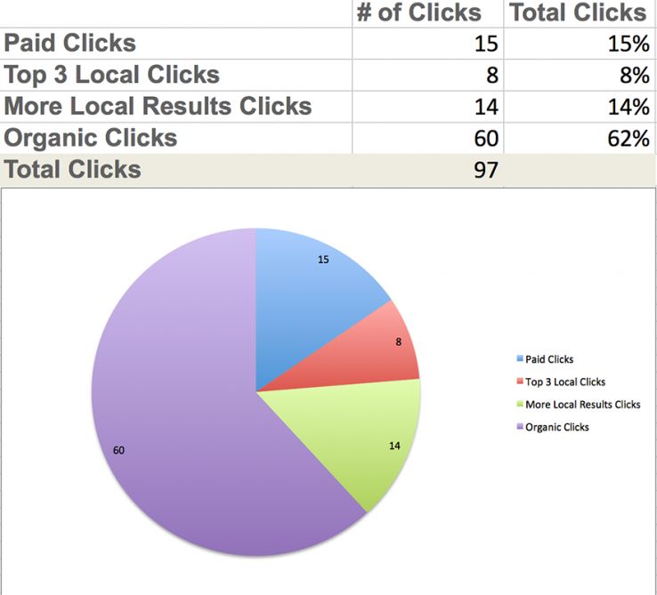 In that example, organic results won, getting almost 40% of clicks. However, this test was based on a search result where there was one organic listing above the local results, as seen in the screenshot below: