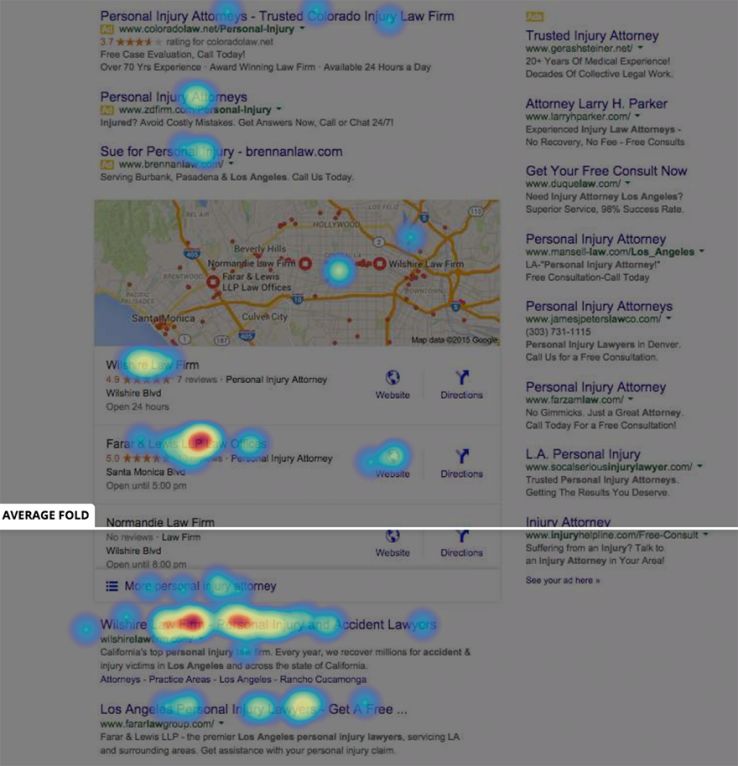 In this test, we displayed the results for a lawyer search phrase: "Personal Injury Lawyer." They were then shown the (pre-heat map) screenshot below. We asked potential searchers the question: "Where would you click on this page if you were looking to find a personal injury attorney?" This is a screenshot of their heat-mapped results. The darker the color, the more clicks an area received: