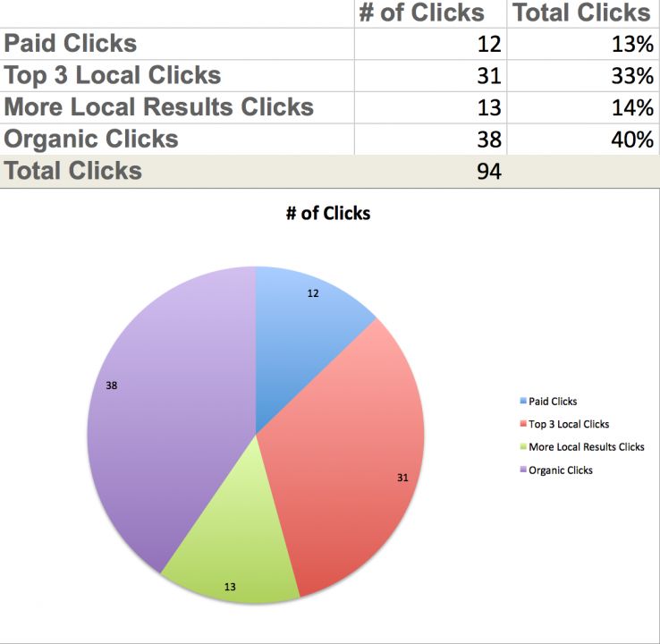 With our first test, we wanted to show a listing that included reviews as a part of the search results. This was purposeful, because we aimed to see if user behavior was impacted by reviews. While we cannot separate all of the variables, it's clear that the majority of the clicks landed on the #1 local listing, on the business name itself (as opposed to the website or directions). The breakdown of clicks is below: